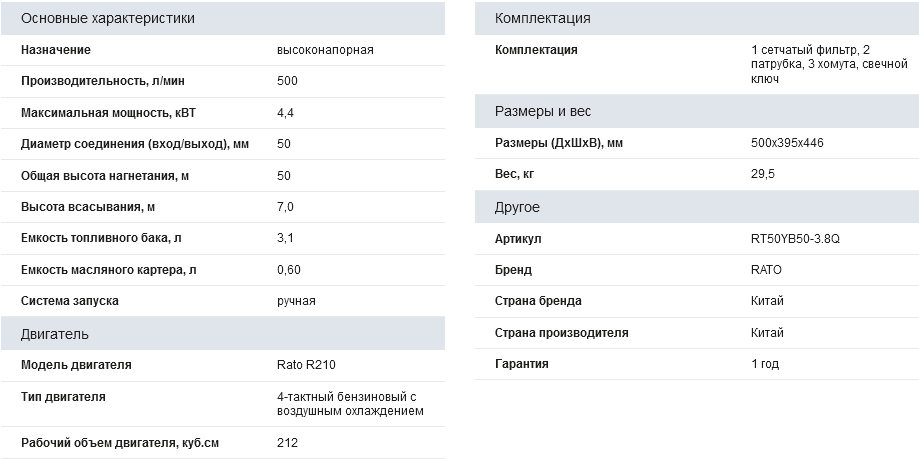 Высоконапорная мотопомпа RATO RT50YB50 оснащена 4-тактным двигателем Rato R210 мощностью 4,2 кВт. Оригинальный, высокотехнологичный двигатель способствует перекачке 500 литров жидкости в минуту. Входное и выходное отверстие мотопомпы имеют диаметр 50 мм.