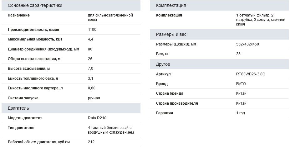 Мотопомпа оснащена четырехтактным бензиновым двигателем RATO R210 мощностью 6 л.с., обладающего непревзойденными техническими характеристиками, в прочем как и все двигатели от компании RATO. Производительность водяной помпы RT80WB26-3.8Q составляет 1100 л/мин. Диаметры соединения 80 мм. Общая высота напора 26 м.